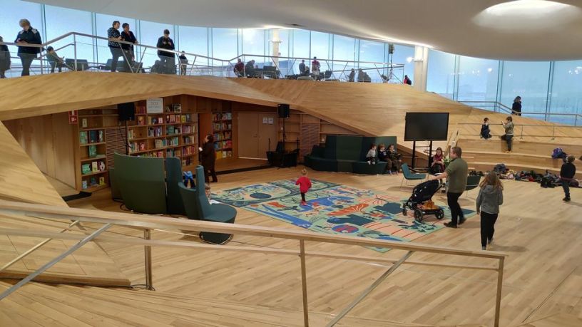 هذه المساحة الشخصية تعكسها الأبنية والطابع العام للعمارة في فنلندا، فالبنية التحتية للمدن تبدو صديقة لحجم الإنسان في تصاميمها مريحة للمشي مسافات طويلة فيها و في نفس الوقت تمتد أبنية الخدمات العامة على هيئة مساحات تسمح للمجتمع بالتواصل والتناغم دون احتدام، وقد كان هذا حاضرا في أكثر من مبنى أهمها وأشدها لفتا لانتباهي كان المكتبة العامة في هلسنكي (في الصورة أعلاه جانب القراء الصغار في مكتبة هلسنكي) والتي تعد تحفة فنية في تصميمها الداعم للابتكار الاجتماعي وإعادة لتعريف دور المكتبة في حياة المجتمع.